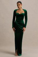 Luxurious velvet fabric in a rich green hue shapes are demure Fay maxi dress. Channeling Hollywood glamour with it’s corseted silhouette, this floor sweeper features long sleeves with structured shoulder pads to exaggerate and accentuate your feminine curves. A split skirt with a statement knot brings equal attention to your gorgeous legs. What better dress to wear to your next black-tie event?